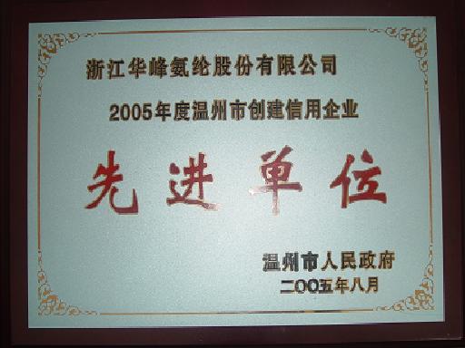 為進一步推進“信用溫州”建設,提高企業(yè)誠信守法經營意識,規(guī)范企業(yè)信用行為,溫州市人民政府決定,命名浙江華峰氨綸股份有限公司等89家企業(yè)為2005年度溫州市創(chuàng)建信用企業(yè)先進單位。