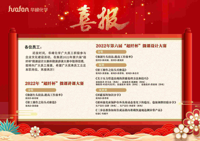 經(jīng)過一個下午緊張激烈的比拼,來自化學公司的林丙琛、黃章勛和聚酰胺事業(yè)部的盧劍等3位選手獲得本屆微課講課比賽金獎,集團公司的黃雪芹等5位選手獲得銀獎。